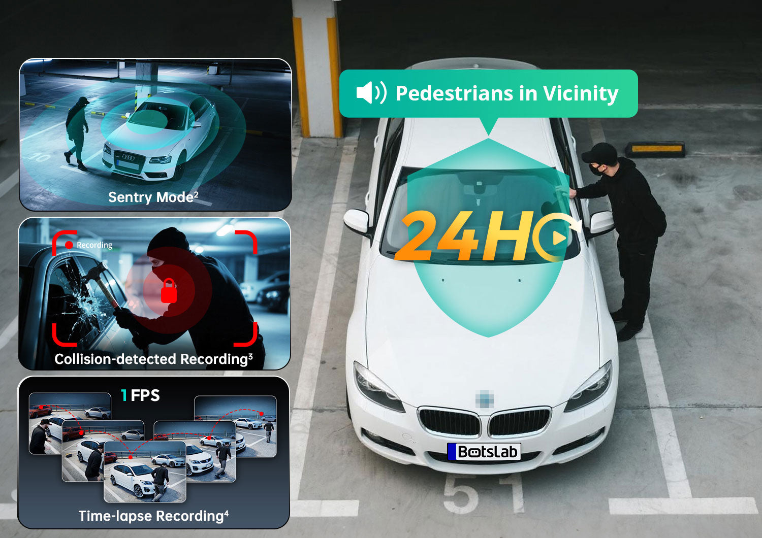 De Botslab G980H Pro 3CH heeft een zeer uitgebreide automatische Time Lapse, bewegingsdetectie en vibratie detectie parkeermodus om de auto te beveiligen tijdens het parkeren. In de Time Lapse modus neemt de camera elke seconde een foto welke later als 30fps video versneld worden afgespeeld. Time lapse opnames zijn iets minder gedetailleerd en nemen daarom minder data op de SD kaart in beslag.