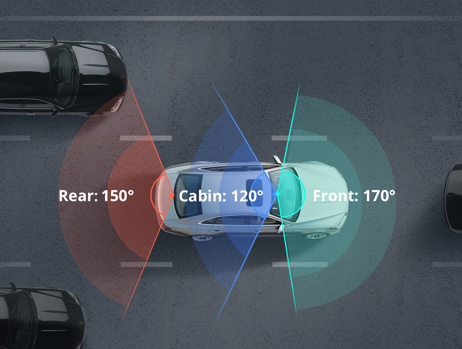 Deze G980H Pro 3CH 4K Wifi GPS heeft een groothoeklens van 170 graden aan de voorkant en 150˚ aan de achterkant. Hierdoor wordt een groot gedeelte rondom de auto opgenomen zodat elke situatie goed wordt vastgelegd. De zijcamera's hebben een kijkhoek van 120˚.