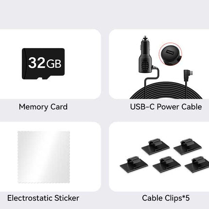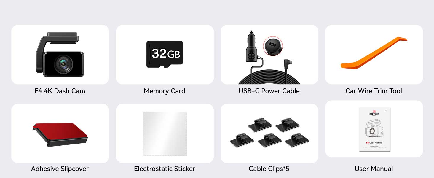 Deze F4 dashcam wordt geleverd met een Micro SD kaart van 32gb, goed voor ongeveer 8 uur aan 4K opnames. Hij ondersteunt Micro SD kaarten tot 256gb waarmee dus ongeveer 64 uur kan worden opgeslagen.