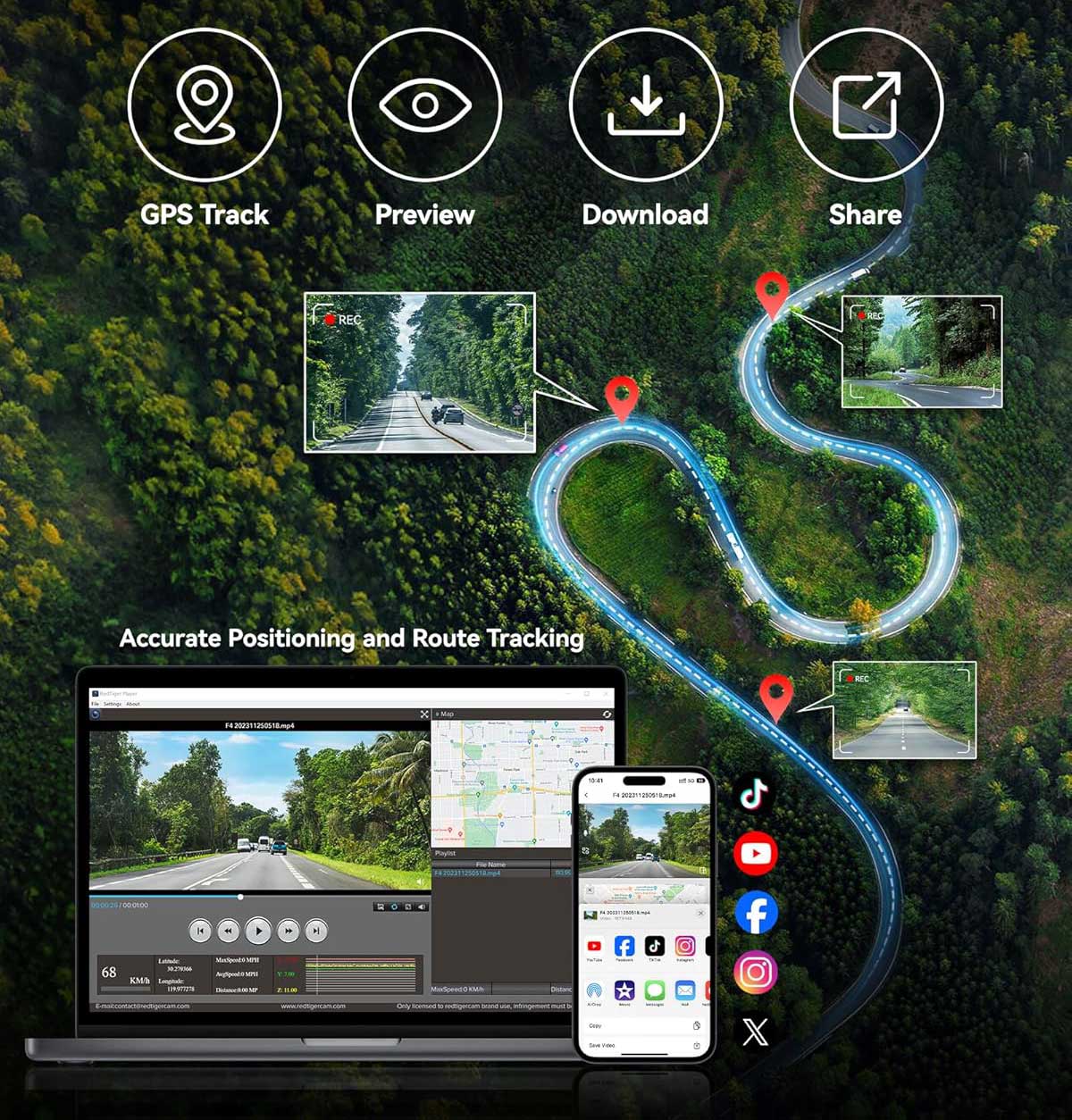De F4 4K Wifi GPS dashcam heeft een ingebouwde GPS module. Door deze GPS module kan de snelheid in beeld worden weergegeven en worden bovendien de coördinaten van de plekken waarop is gefilmd bijgehouden. Hierdoor kan later met de meegeleverde software precies worden bekeken waar bepaalde opnames zijn gemaakt.