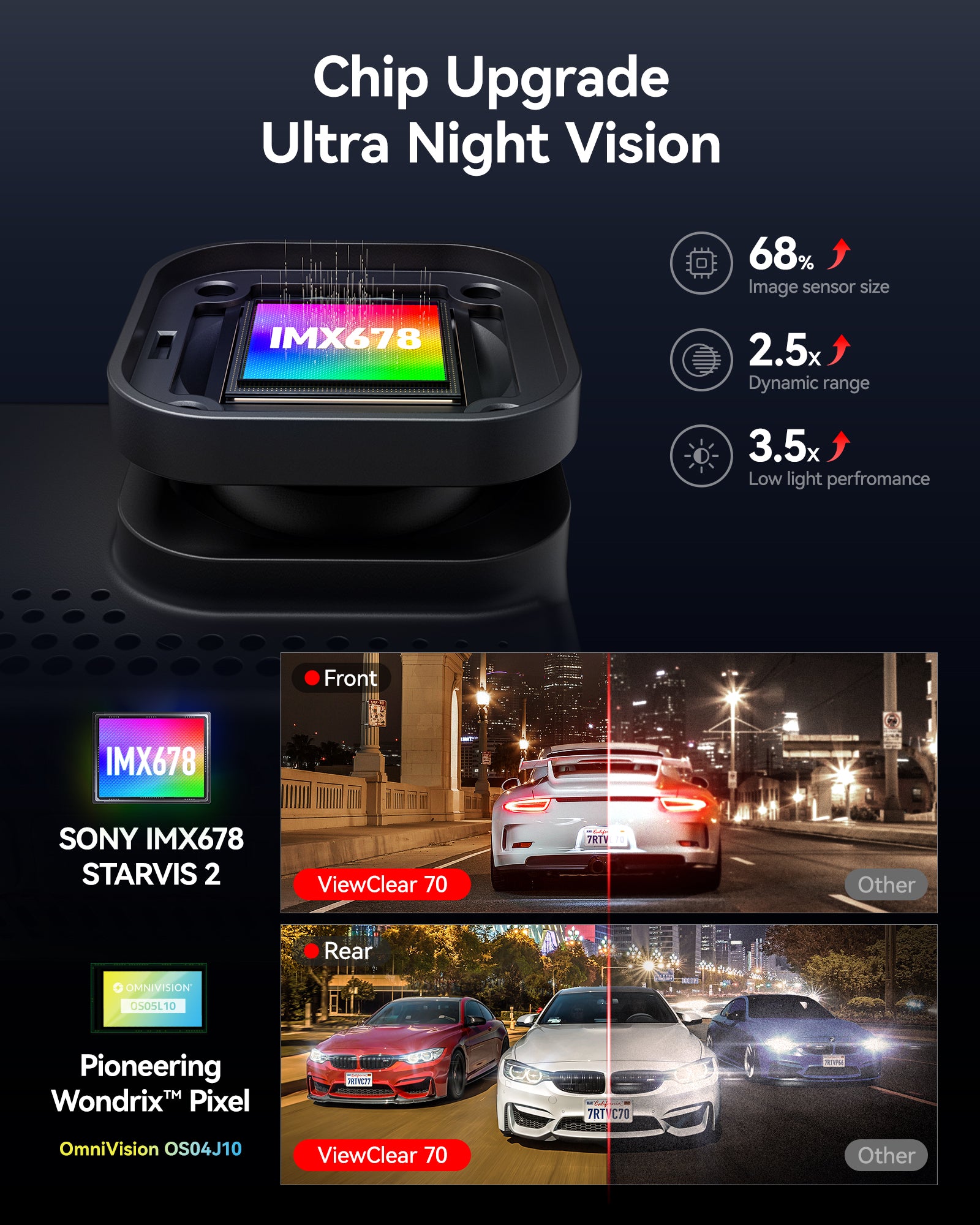 De voorcamera van de Redtiger ViewClear 70 filmt in scherpe Ultra 4K resolutie (3840x2160p), waardoor belangrijke details zoals kentekens en verkeerssituaties duidelijk worden vastgelegd. De achtercamera filmt in Full HD 1080p, zodat ook het verkeer achter de auto continu wordt opgenomen. Dankzij HDR/WDR technologie blijven beelden helder bij zowel fel zonlicht als in het donker.