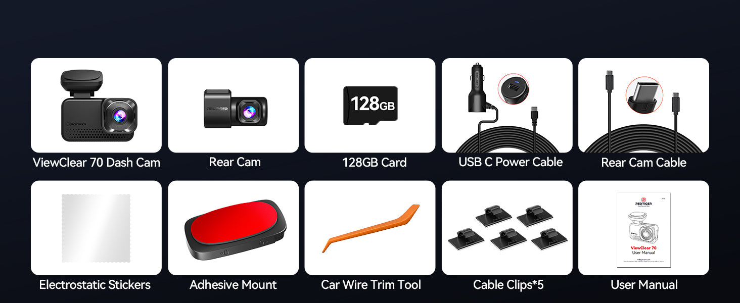 De Redtiger ViewClear 70 is een hoogwaardige 4K dual dashcam met modern design en een gebruiksvriendelijk touchscreen. Dankzij de krachtige beeldsensor, ingebouwde wifi en GPS en de meegeleverde 128GB Micro SD kaart is deze dashcam ideaal voor bestuurders die maximale zekerheid en beeldkwaliteit wensen, zowel tijdens het rijden als bij het parkeren.
