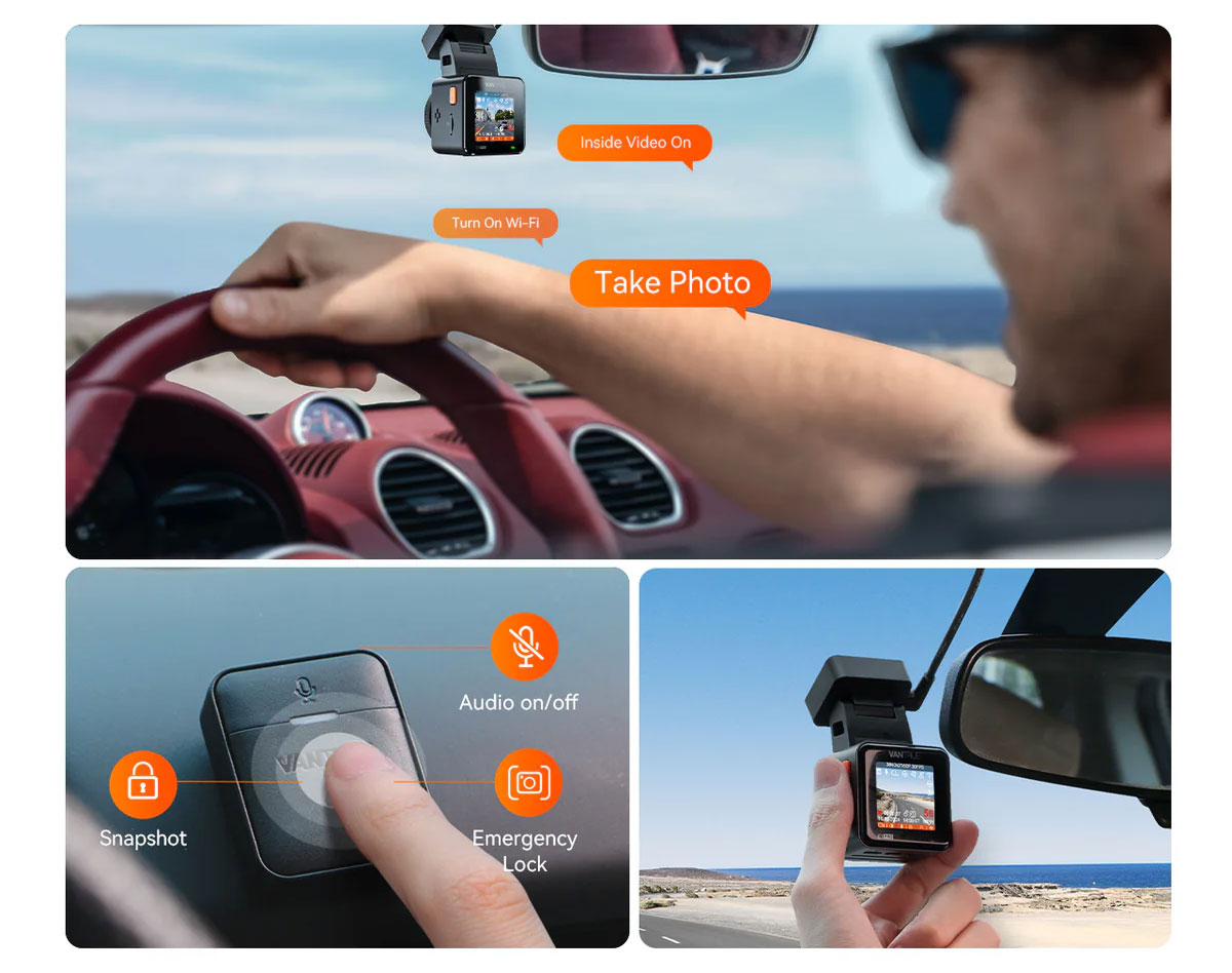 De Vantrue E1 Pro geeft je de mogelijkheid om de dashcam via (Engelstalige) gesproken commando's te besturen. Door commando's zoals 'Make picture', 'Turn off screen', 'Turn on audio' en 'Lock the video' kun je de dashcam veilig tijdens het rijden gebruiken en mis je geen enkel incident.