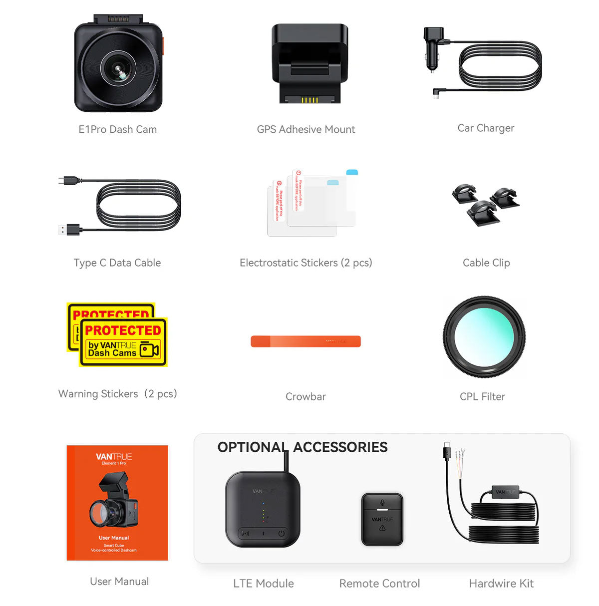 De Vantrue E1 Pro is de kleinste Cloud dashcam van Vantrue. Verbind hem met de optionele LTE module om overal ter wereld te verbinden met je camera. Hij filmt in zeer scherpe 4K resolutie door de Sony Starvis IMX678 beeldsensor en met de PlatePix technologie zijn kentekens altijd herkenbaar in beeld.