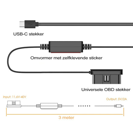 Met deze Vantrue OBD voeding sluit je je dashcam super makkelijk aan op de permanente stroom van de auto. Plug de OBD stekker in de OBD poort van je auto en sluit je Vantrue dashcam met de USB-C kabel aan. De dashcam zal vervolgens automatisch in- en uit de parkeermodus schakelen zodra je de auto aan- en uitzet.