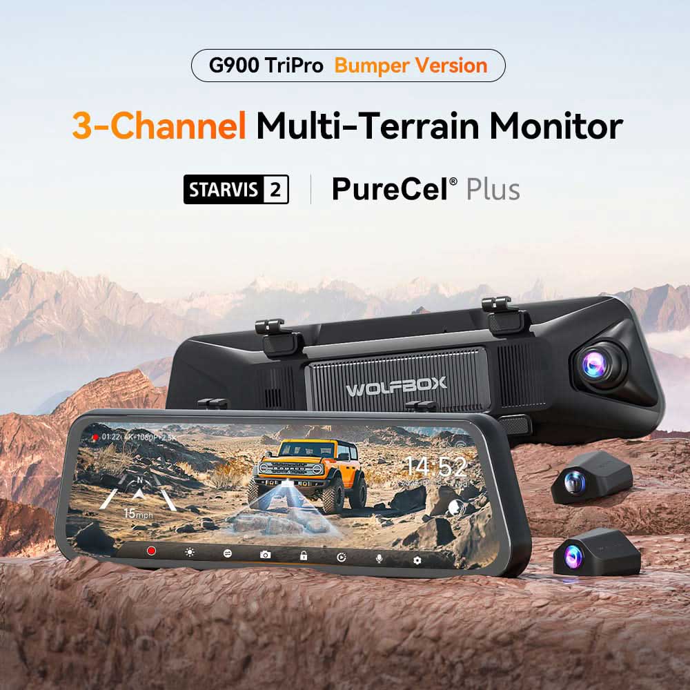 De Wolfbox G900 Tripro bumper is de eerste 3-kanaals spiegel dashcam met een voor achter camera en nog een derde camera voorop de bumper. Deze dashcam is daarmee speciaal ontworpen voor off road gebruik. De G900 Tripro filmt met de Starvis 2 sensor in 4K aan de voorkant en 2,5K aan de achterkant. De bumper camera filmt met FullHD. De dashcam is daarnaast uitgerust met alle functies zoals Wifi, GPS en een parkeermodus om al je ritten en parkeersessies te registreren.