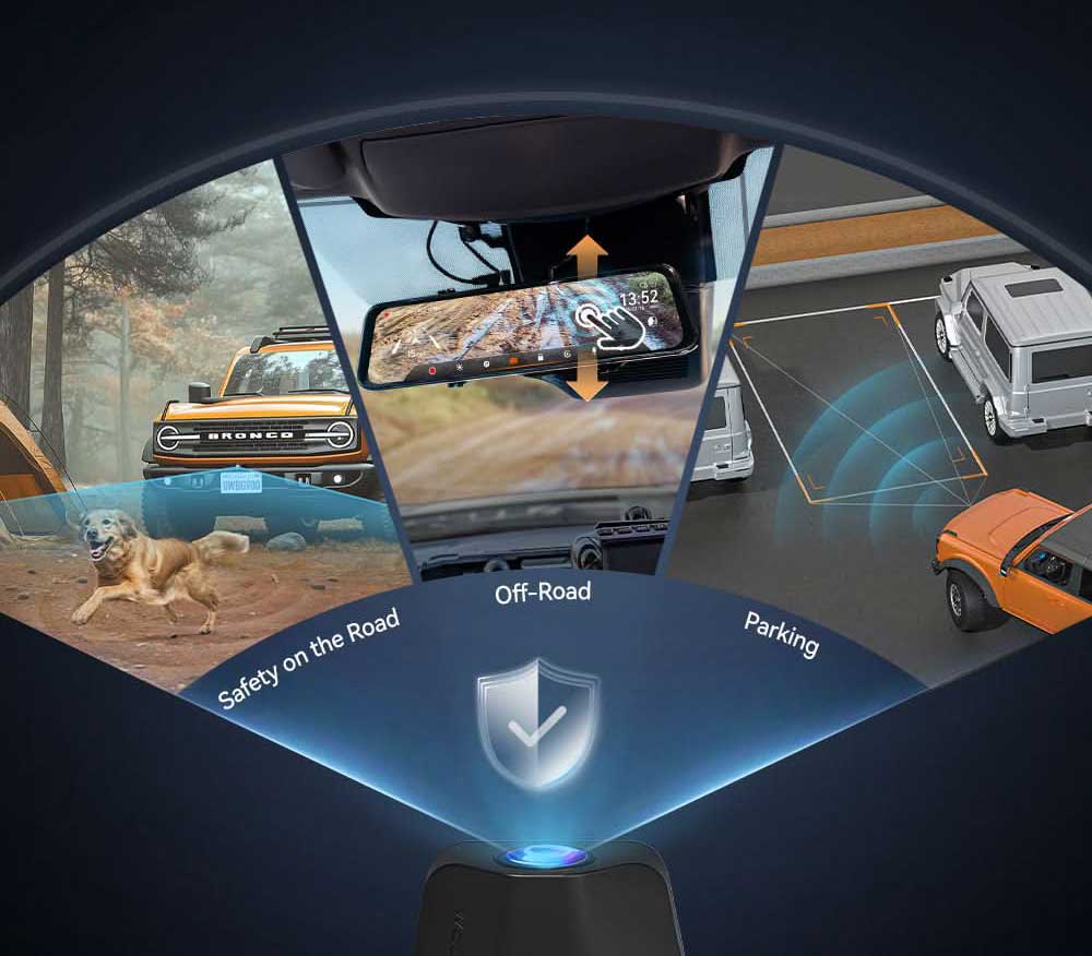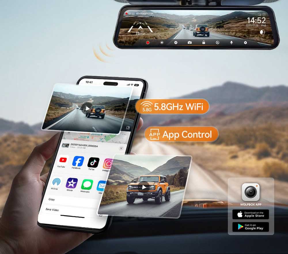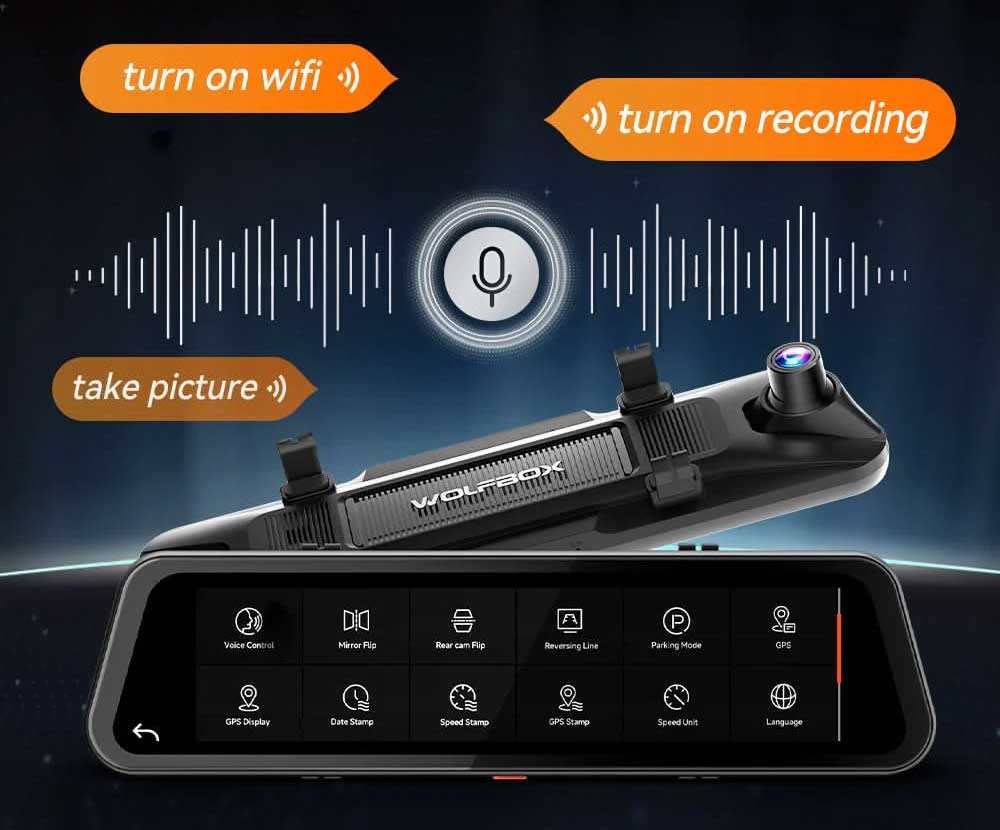 De Wolfbox G900 Tripro 4K is een uniek vormgegeven spiegel dashcam en digitale binnenspiegel in één. De grote 12 inch spiegel fungeert tevens als volledig digitaal LCD scherm waarop het beeld van de achter camera kan worden weergeven. De Wolfbox G900 is daarom ideaal voor in voertuigen met slecht zicht naar achteren. Hij wordt geleverd met beugels om hem over een bestaande binnenspiegel te plaatsen. Optioneel is ook een houder voor de voorruit of voor op het dashboard beschikbaar voor in voertuigen zonder binnenspiegel.