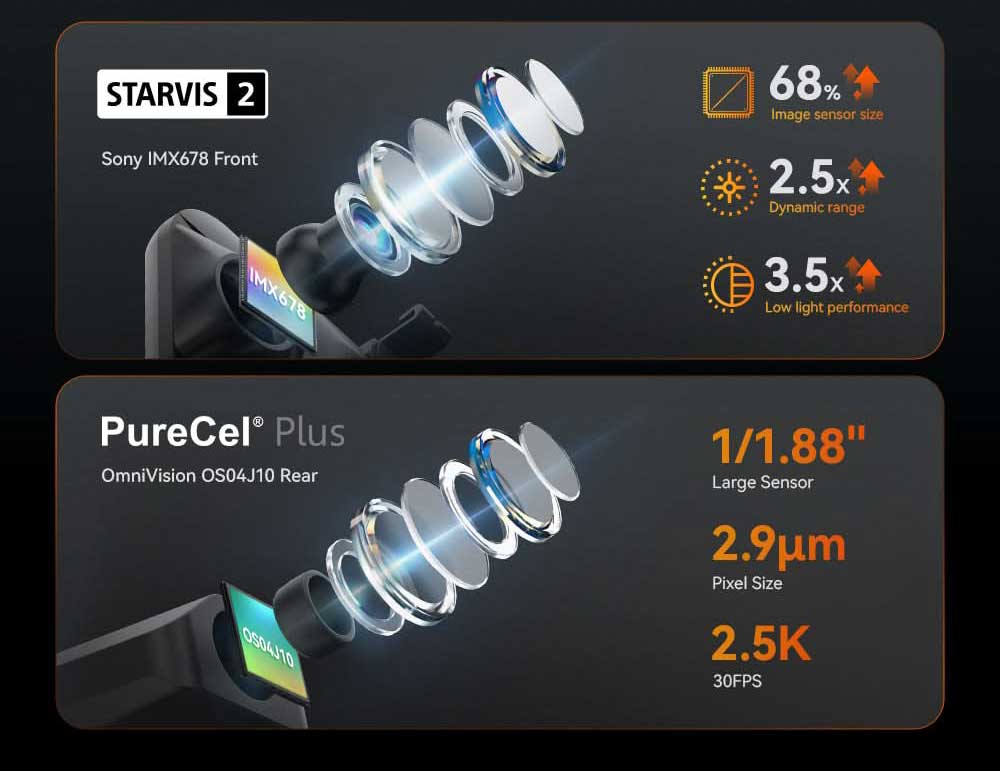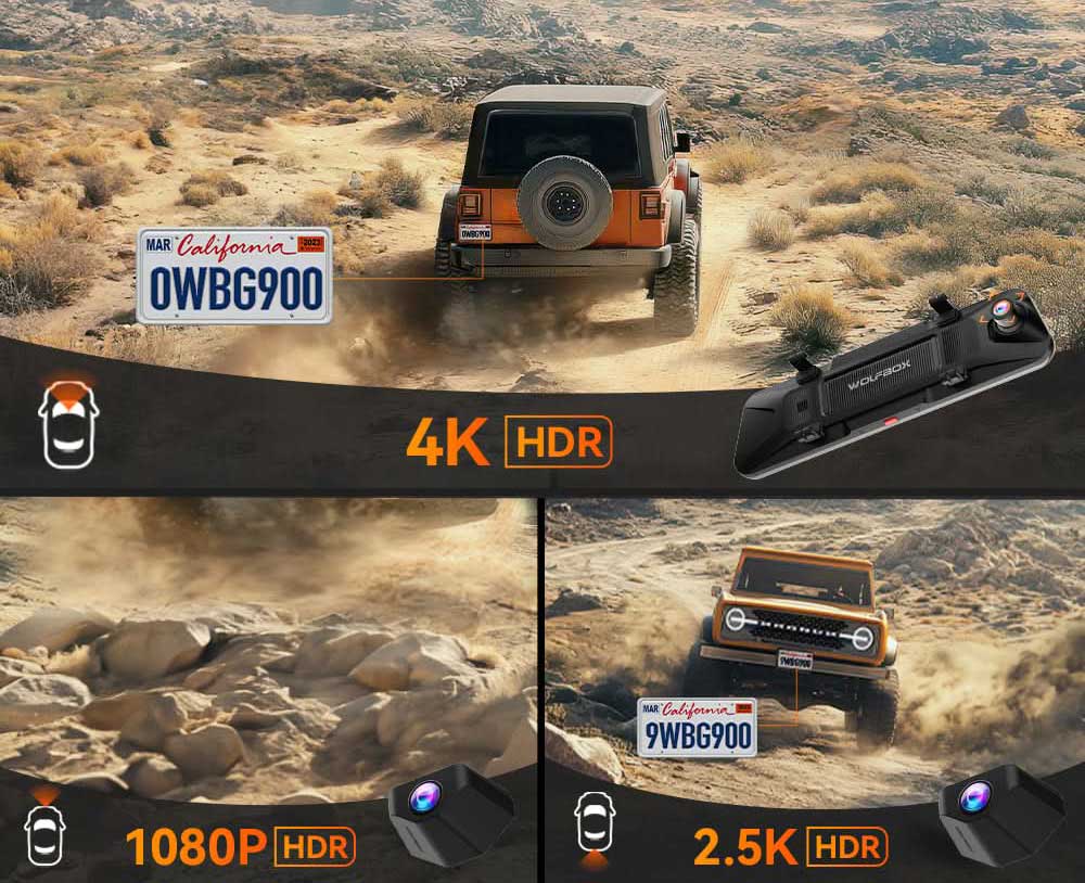 De Wolfbox G900 Tripro is uitgerust met de nieuwste Sony Starvis 2 sensor die garant staat voor de beste beeldkwaliteit, met name in het donker. De voorste camera neemt op in haarscherpe 4K resolutie met 30fps en de achterste camera met 2,5K in 25fps. De derde interieur camera filmt met FullHD.